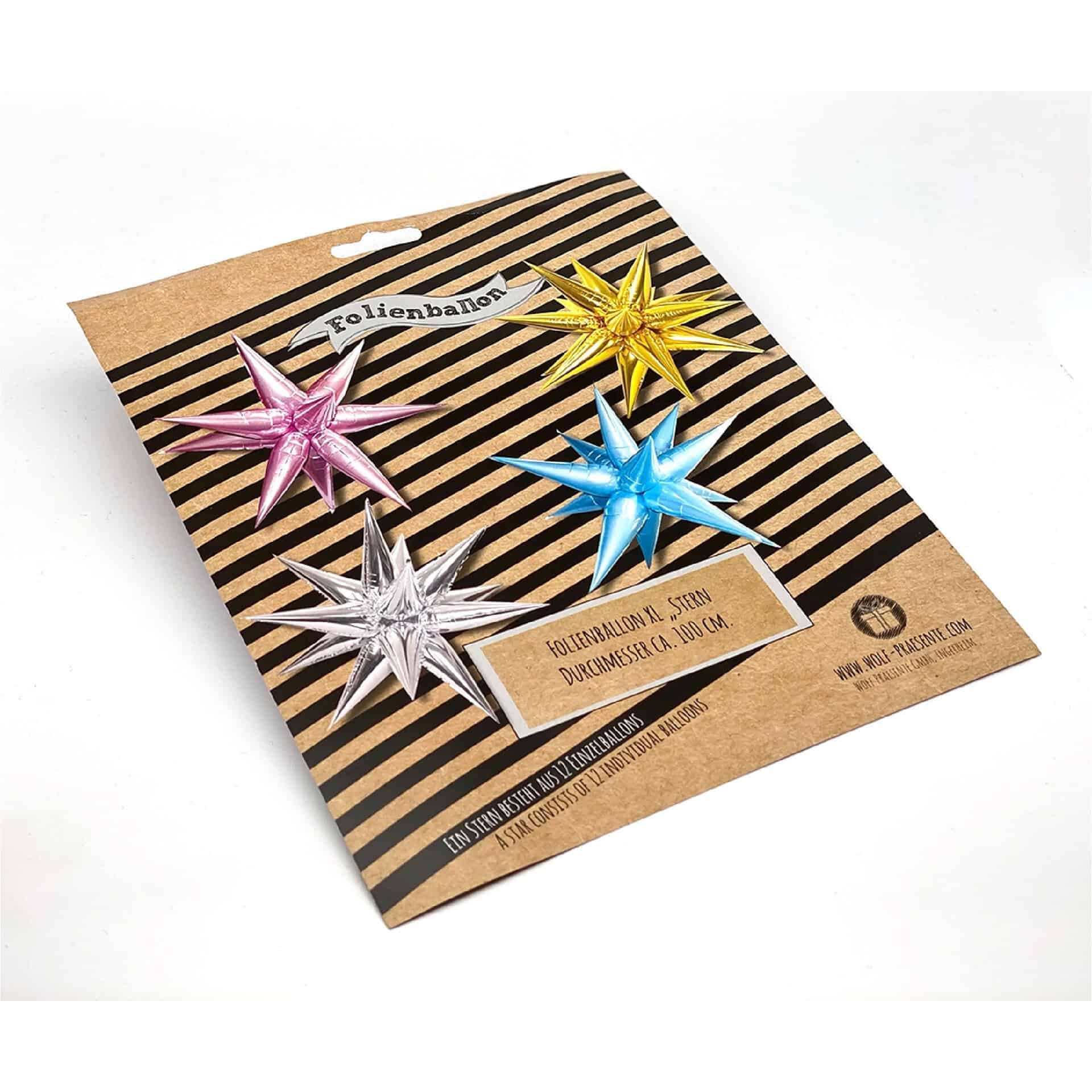 Ilmapallot toimitetaan litteinä 12 erillistä pienempää sakaraa pakkauksessa, ja ne on täytettävä ja sitten koottava kuvan mukaiseksi metrin mittaiseksi tähdeksi.