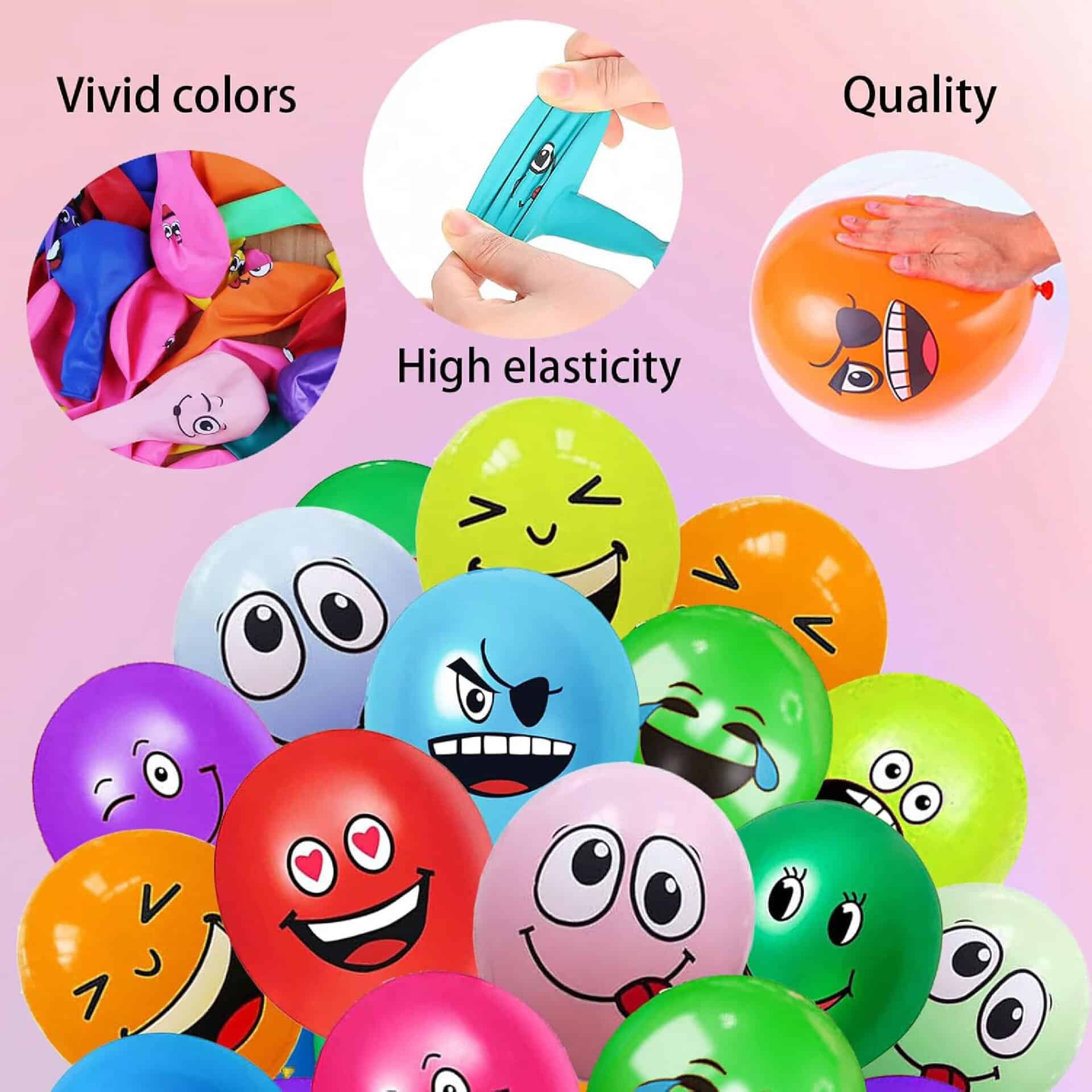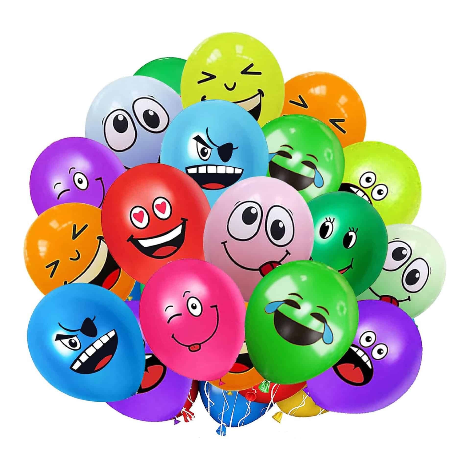 Palloissa on 6–12 erilaista ilmettä: suukko, yllätys, nauru, ihailu, tunnustus ja muita ilmeikkäitä hahmoja, jotka tuovat iloa juhliin!