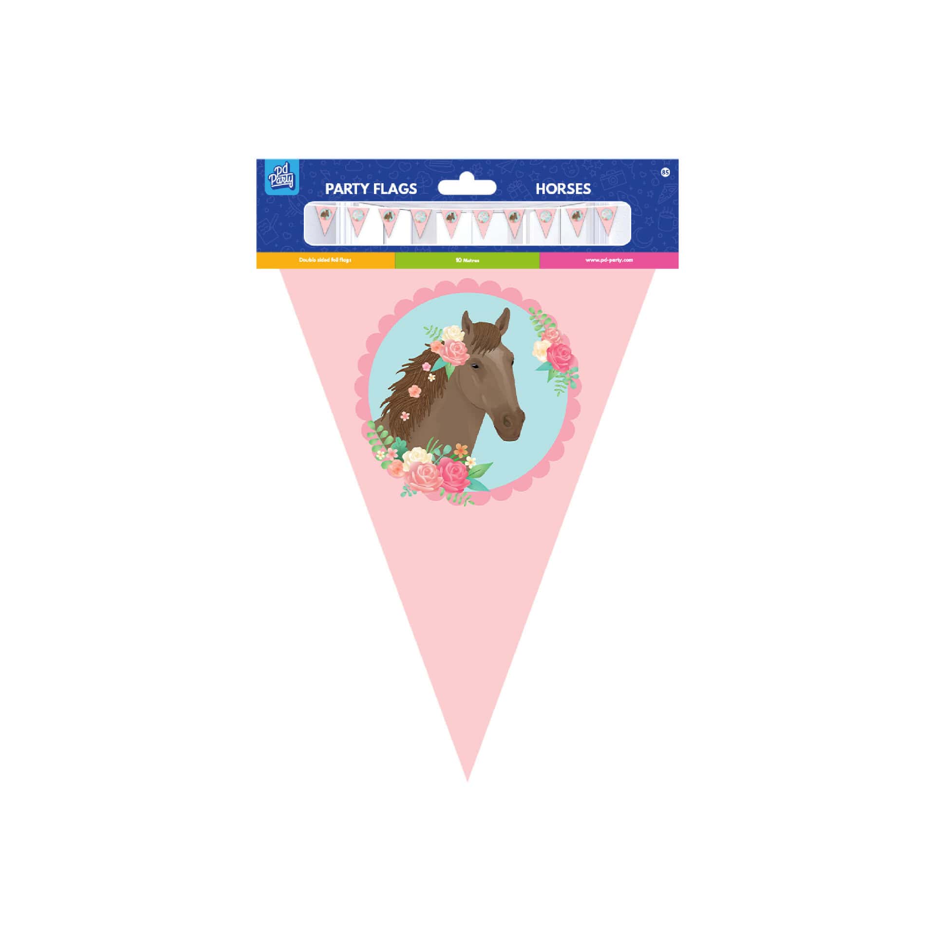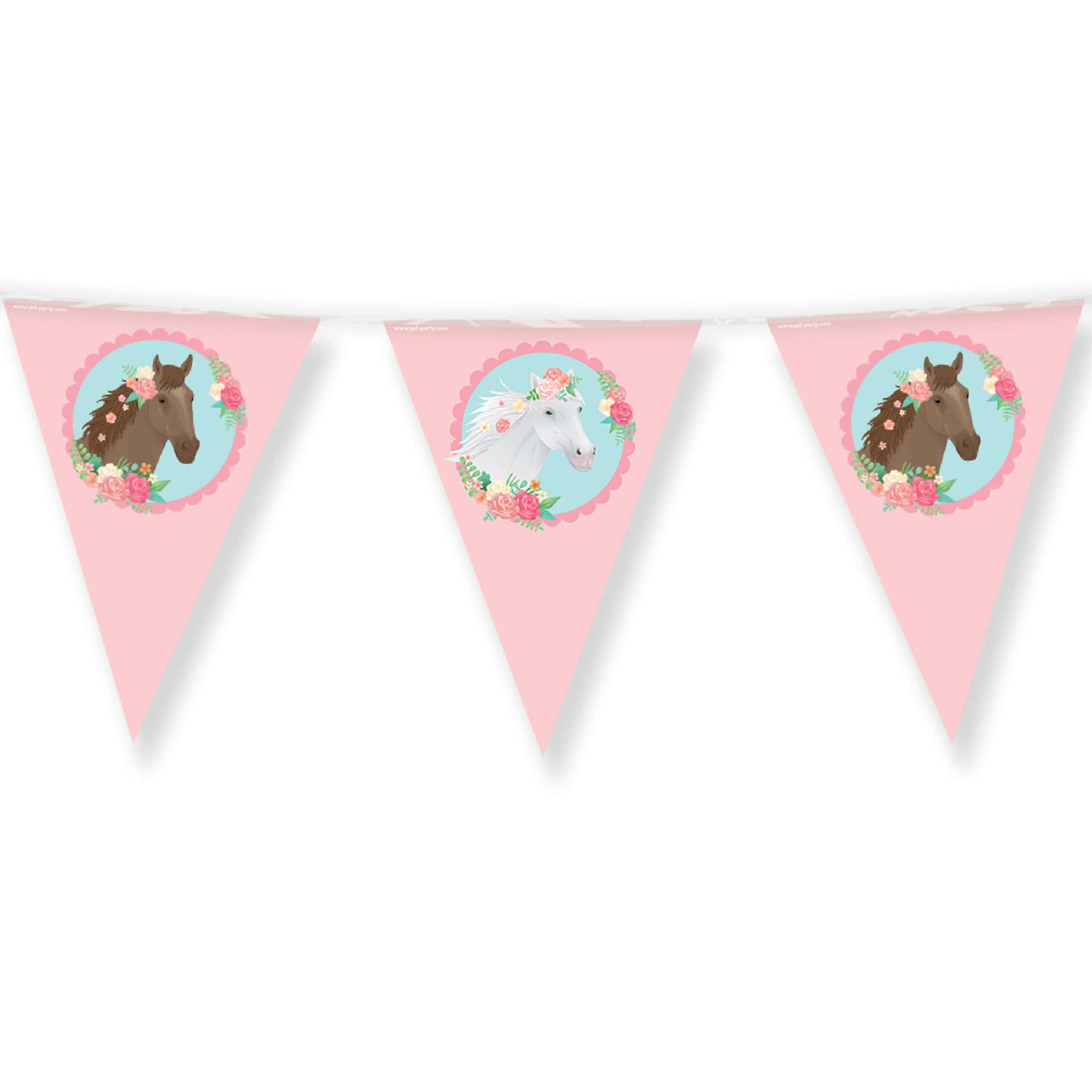 Muovinen lippuviirinauha hevos aiheisella kuvioinnilla on täydellinen somiste juhliin, joissa hevoset ja eläimet ovat teemana.