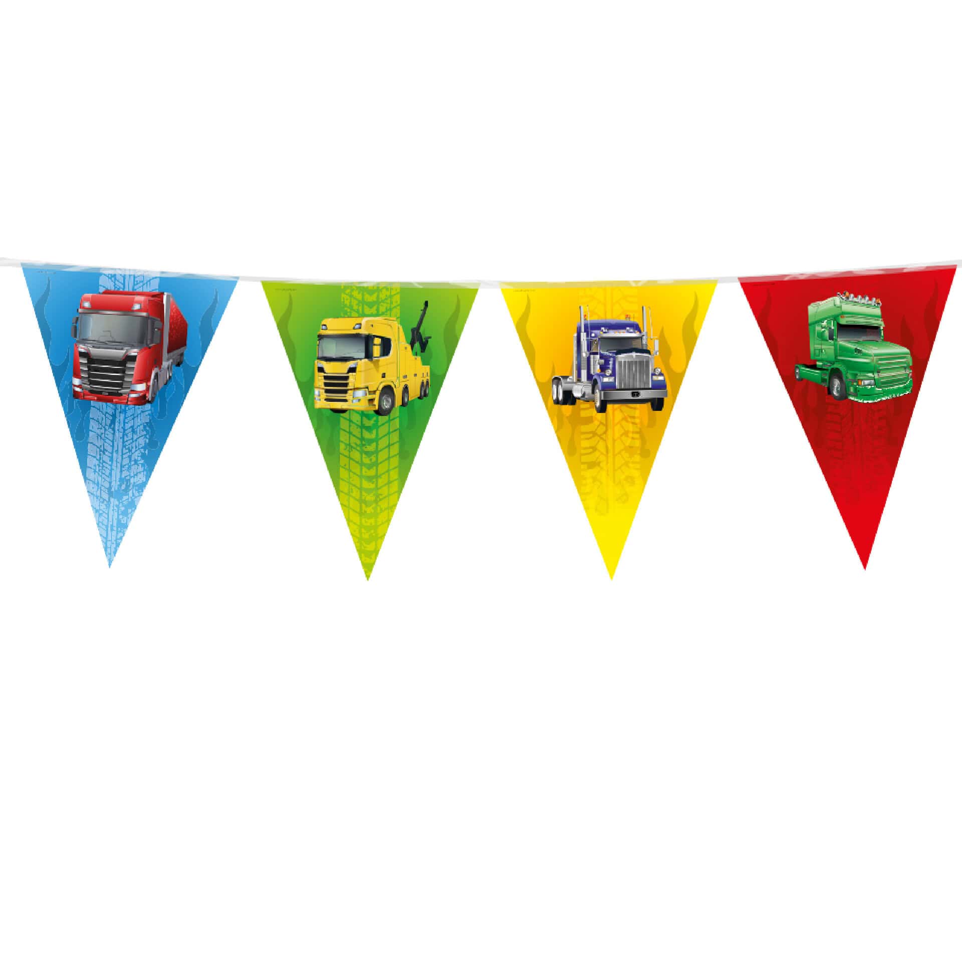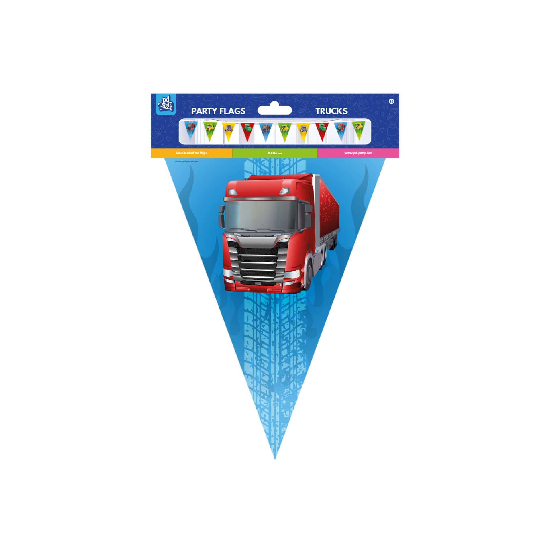 Muovinen lippuviirinauha kuorma-auto aiheisella kuvioinnilla on täydellinen somiste juhliin, joissa ajoneuvot ovat teemana.